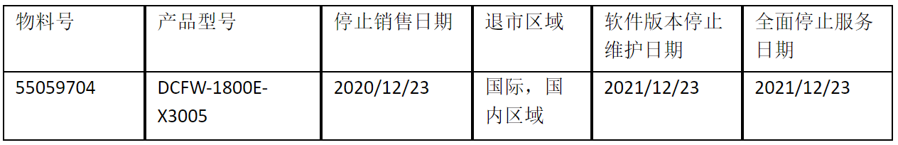 北京米兰(中国)AC米兰数码云科信息技术有限公司正式通知您, 以上DCFW-1800E-X3005下一代防火墙(55059704)将于2020年12月23号停止接收新的订单(具体日期见上表),不再供货。给您带来的不便,敬请原谅。